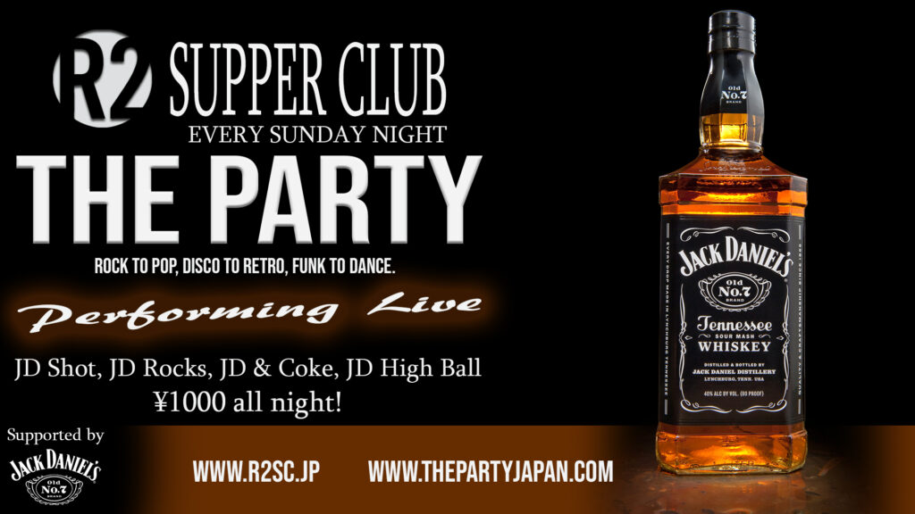 Catch THE PARTY live every Sunday night at R2 Supper Club in Roppongi. Music Start from 9pm, plus DJs. Great food and drinks available all night.